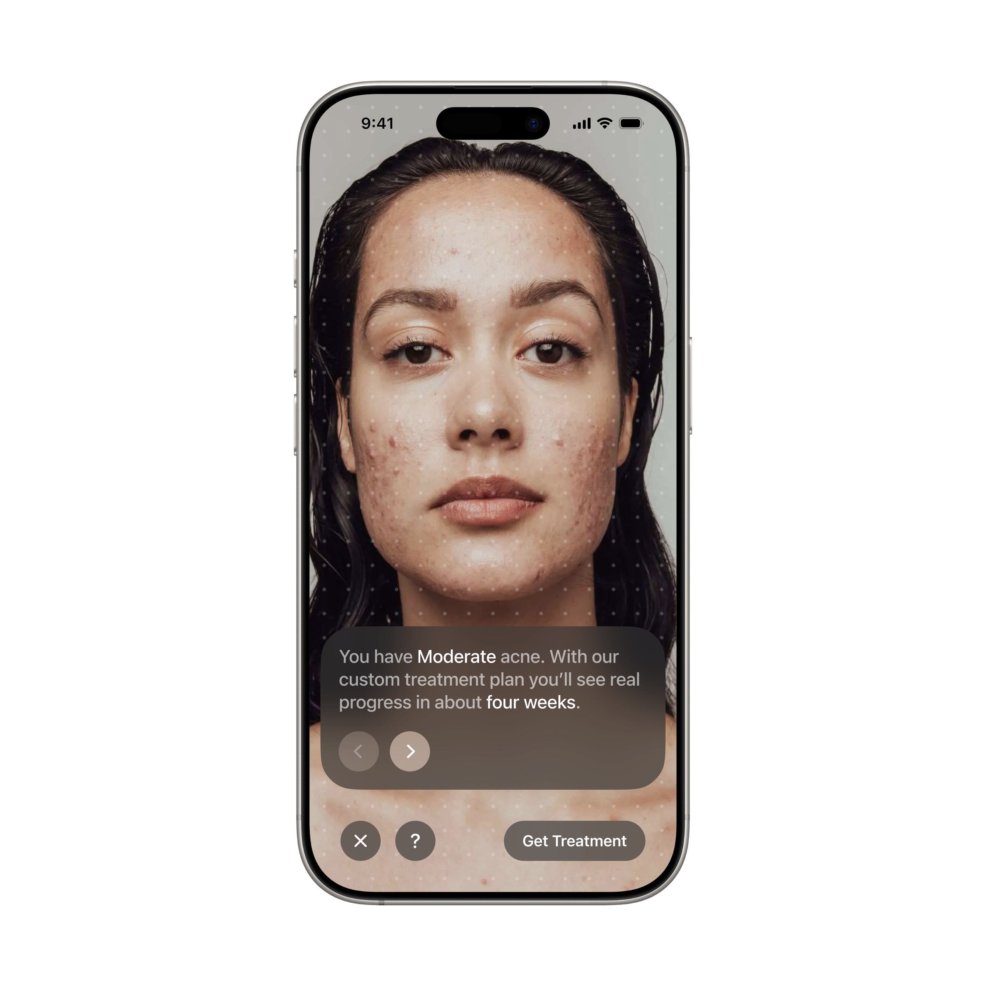 The scanning dots that simulate real-time analysis bridge the gap between submitting a photo and getting results, making the AI processing step feel visible and trustworthy — a clean, restrained interface that builds trust through what it doesn't do.