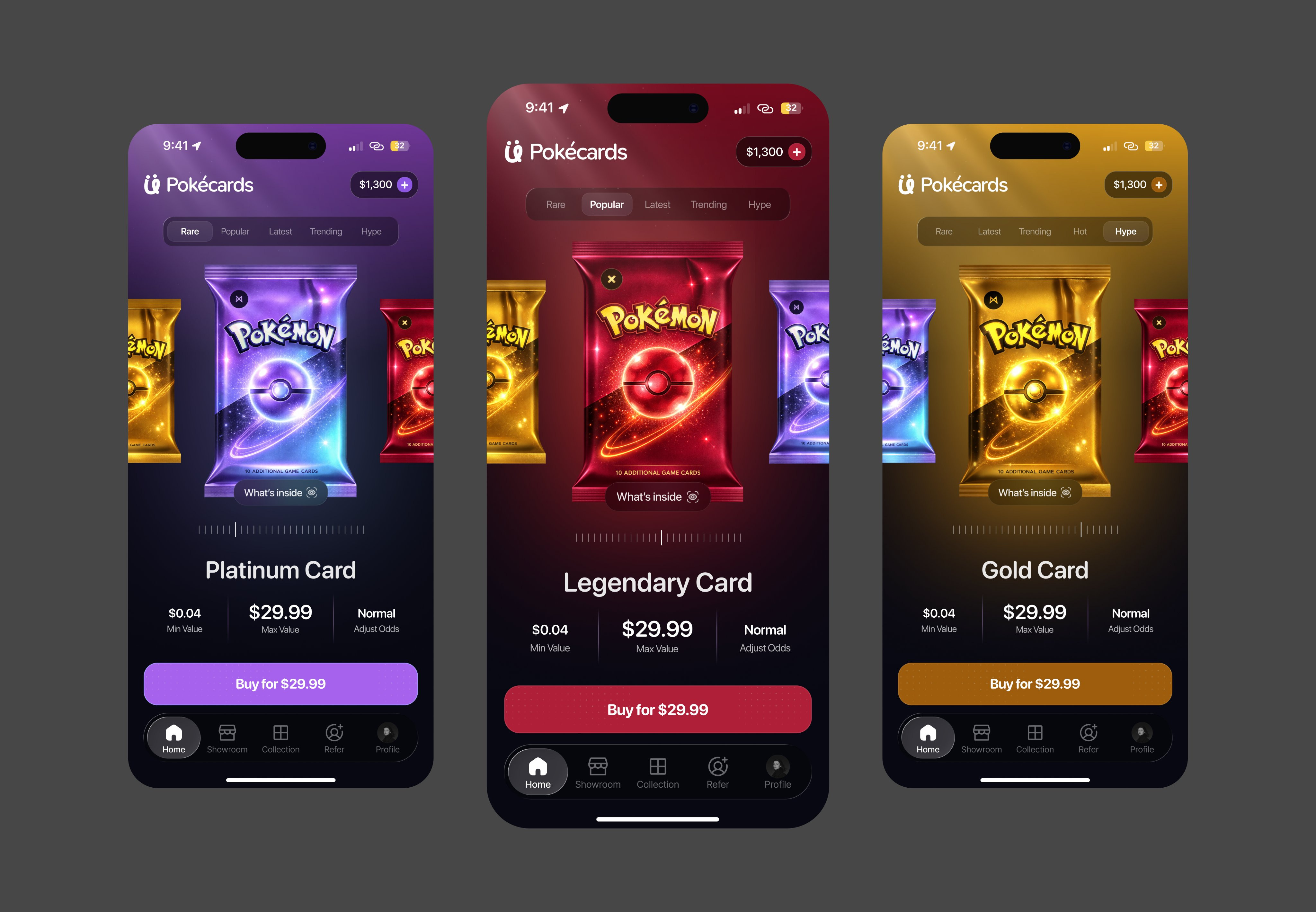 If you're looking for bright, attractive designs, it doesn't get better than this. The featured card — a character illustration that commands centre stage — becomes the gravitational centre of the entire screen's design system. Every button colour, every gradient in the background, all derived from the card's palette, creating a cohesive visual environment that shifts as users browse different cards. It's a collector experience that treats digital cards with the same reverence a luxury retailer gives a handbag, and the vibrant palette makes browsing feel like exploring a treasure chest rather than scrolling a marketplace. The e-commerce layout adapted for a collector showcase is smart — detailed complexity is justified here because collectors want to linger and appreciate every detail. Steal this technique of deriving your entire screen's colour system from a single hero content element — it creates a world around each piece of content that makes users feel immersed, and it works anywhere you've got featured imagery that dictates mood.