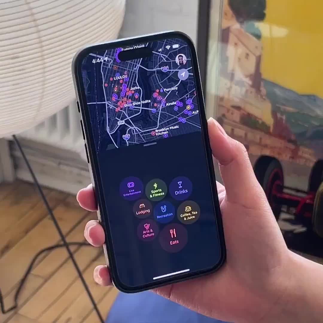 This moving orb style that feels like a lava lamp — fluid, organic, almost alive — is a completely distinct approach to map-based navigation. Rather than conventional static pins that feel clinical, this organic movement creates an emotional connection to the exploration process that no other nightlife app is doing right now. The dark mode canvas with vibrant accents matches the energy of going out at night perfectly, and the bold typography paired with an interactive list overlay gives users two ways to browse venues without switching contexts. The fluid motion design is the standout here — the visual language matches the content domain so well that the map interface pulses with the energy you'd expect from nightlife discovery. This is what happens when a designer actually thinks about how the interface should feel, not just how it should look.