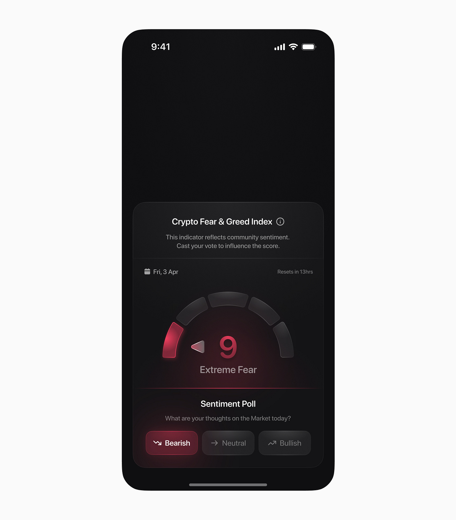 The sheer craft here — gradient colours, light speckles emulating liquid glass — turns a standard sentiment dashboard into something crypto users will actually screenshot and share, because the design itself becomes the content.
