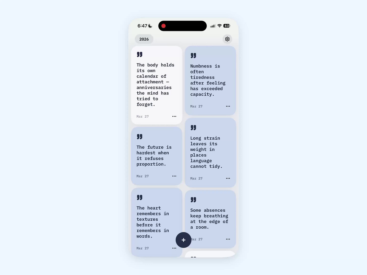 The burn interaction here is genuinely novel — it adds emotional catharsis to the journaling process, turning what could be a passive reading experience into something tactile and deeply satisfying. The calm card carousel with cool tones creates exactly the right headspace for daily reflection, and each entry sitting in isolation means you're never overwhelmed by a wall of past thoughts. The minimalist treatment reinforces the reflective mood without making the app feel sterile — there's warmth in the simplicity. The card-based navigation is psychologically smart for a product designed around daily emotional processing, because temporal separation between entries prevents the anxiety of seeing everything at once. Steal this approach of using destructive gestures as emotional release mechanisms — the burn interaction gives users agency over their own thoughts in a way that typing "delete" never could, and it's a pattern that could work in any app where users need to let go of something.