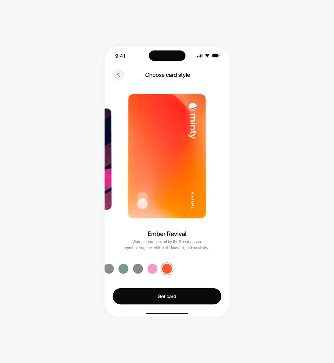 I really enjoy how simple this is, and I feel a lot of users will love picking virtual card colors this way. This is one of the simpler renditions I've seen and it's very enjoyable. Rotating the card to portrait instead of landscape takes up more screen space and makes it way more eye-catching. The color picker below with the white border stroke is very simple and nice. Having custom names for the colors with little details of where they came from adds sentiment and makes it warmer and more inviting. They know where to put attention—the card is the only thing that matters and everything else stands back to let the card shine, no competing elements. They get that ideology down to a T.