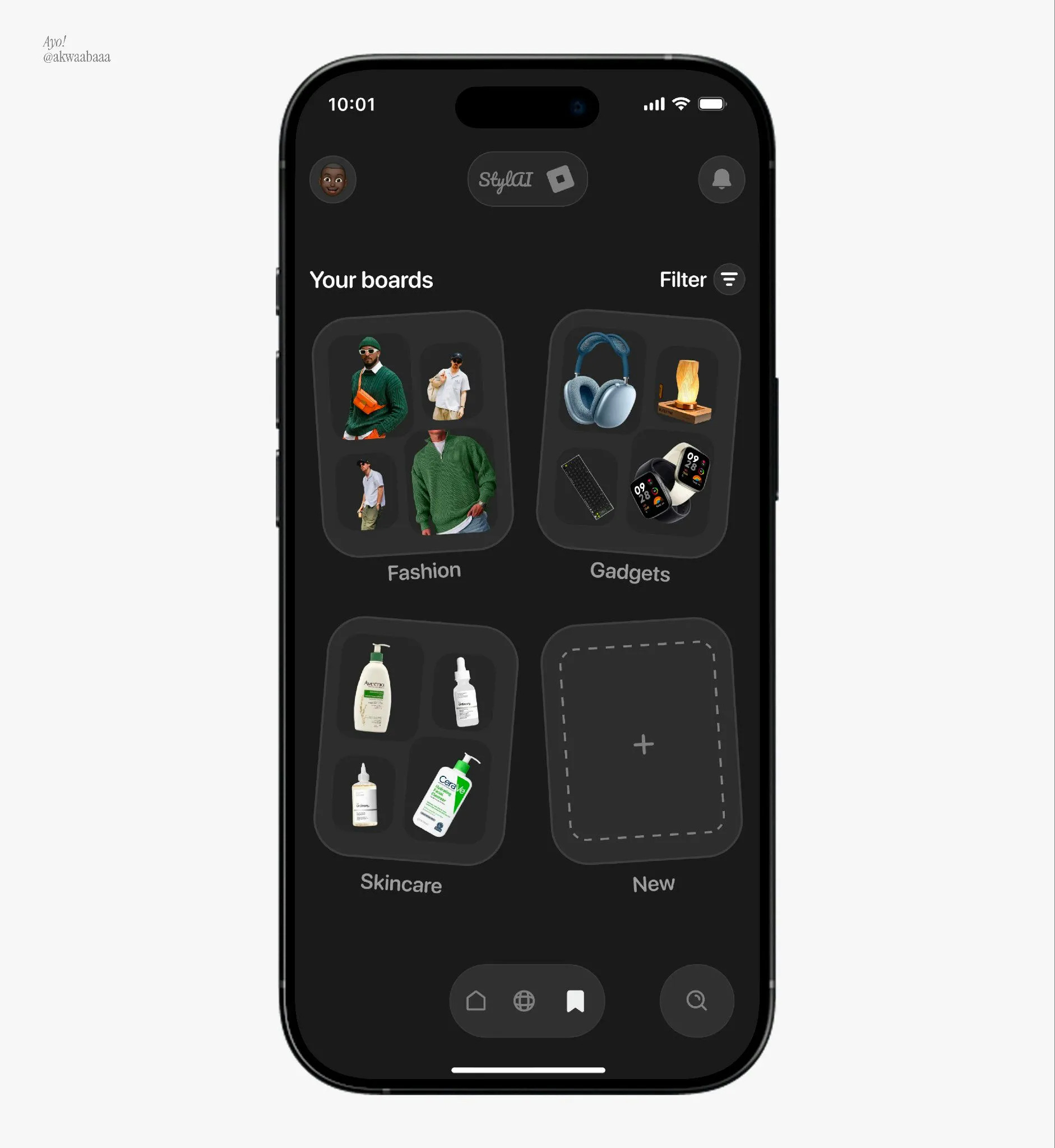 This one is very unique—showcasing mood boards with tilted cards (probably inspired by Darryl Ginn who used to do this a lot) adds flexibility instead of rigid grids. I think it adds a lot here, especially for a more fun, experimental application with boards. The dark mode color scheme isn't too dark—the background is off-gray not jet black, which makes it very inviting and easier on the eyes, and the text is more legible. I'd love to see the animations for screen-to-screen transitions, like if you click the fashion board and zoom into it to see the posts. That would be a nice touch.
