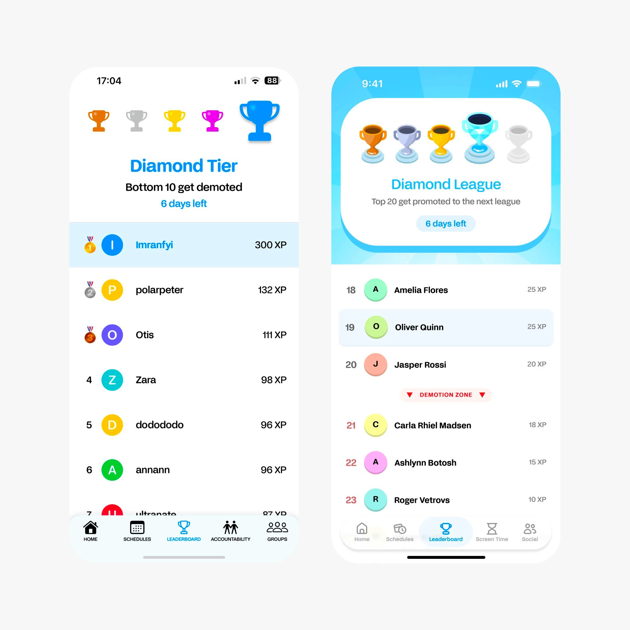 This is a before and after, and the entire philosophy changed. The old screen demotes the bottom 10 — Shane’s version promotes the top 20. Same mechanic, completely different emotional outcome. Colour earns its place here too; the trophy tiers use gold, silver, bronze with actual purpose, not decoration. If you’re building any kind of competitive feature, steal the reframe: make users want to climb, not afraid to fall.