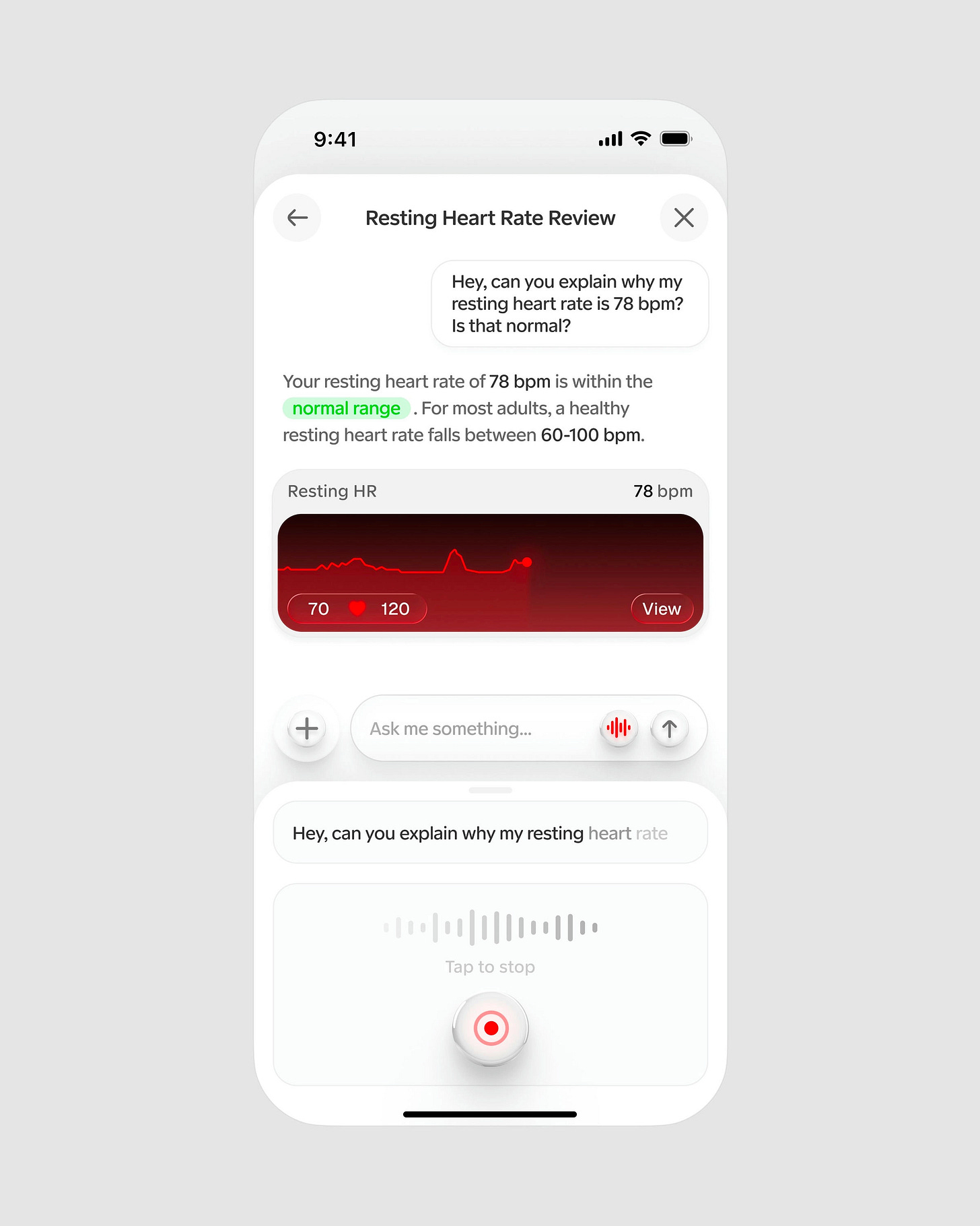 White doesn't mean boring. It means you borrowed trust from somewhere people already feel safe. Studio Sphere's health app pulls the same visual language as a doctor's office — clean, uncluttered, nothing competing for attention — so when your resting heart rate shows up, it actually feels like information worth paying attention to. The "normal range" tags inside the text blocks do a lot of quiet work. You're not just seeing a number, you're being told whether to worry about it. That's the whole job of a health interface.