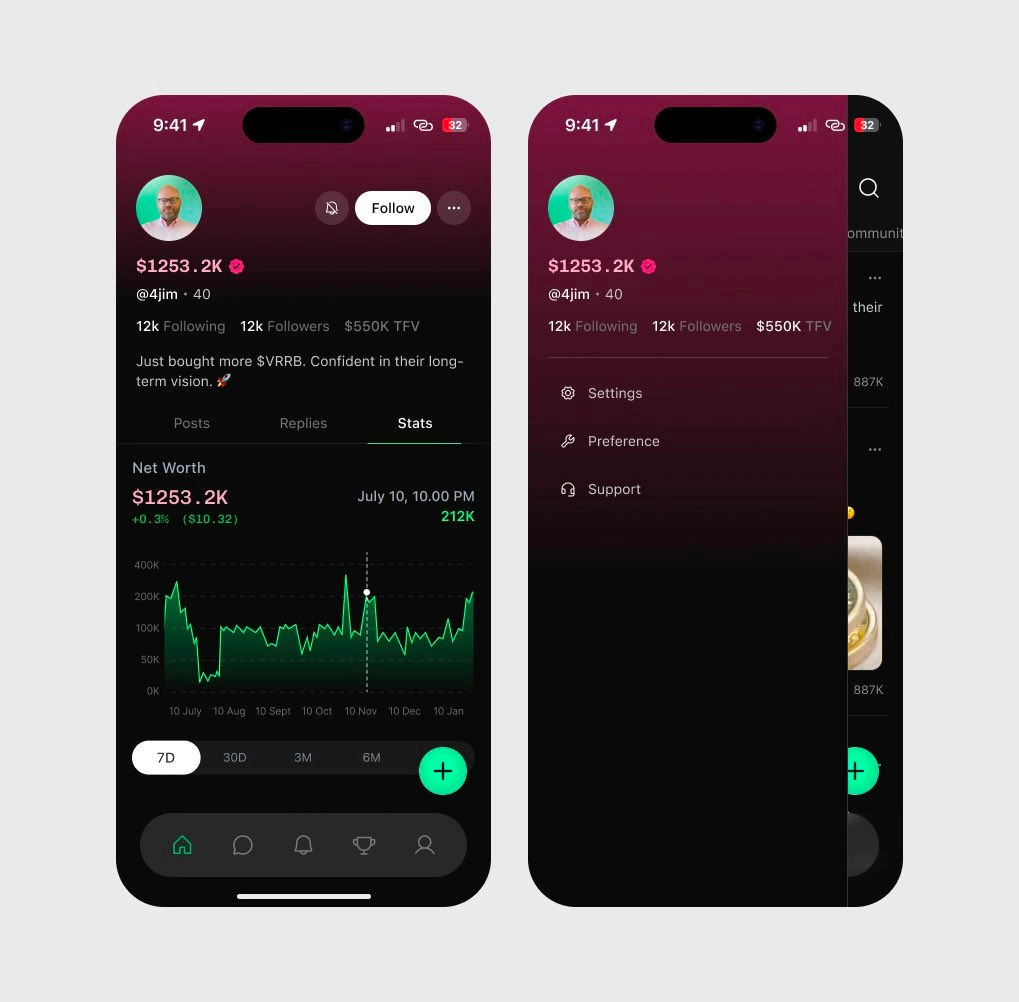 Dark mode in crypto isn't a style choice, it's a trust signal — and Jay leans into that deliberately. The dark canvas reads as serious and built for people who know what they're doing before you've clocked a single number. That red gradient glow in the background might be reacting to portfolio performance. If it is, and it glows red when you're down, that's a design decision I genuinely respect. Colour sets the tone before the data does — this is a good example of that.